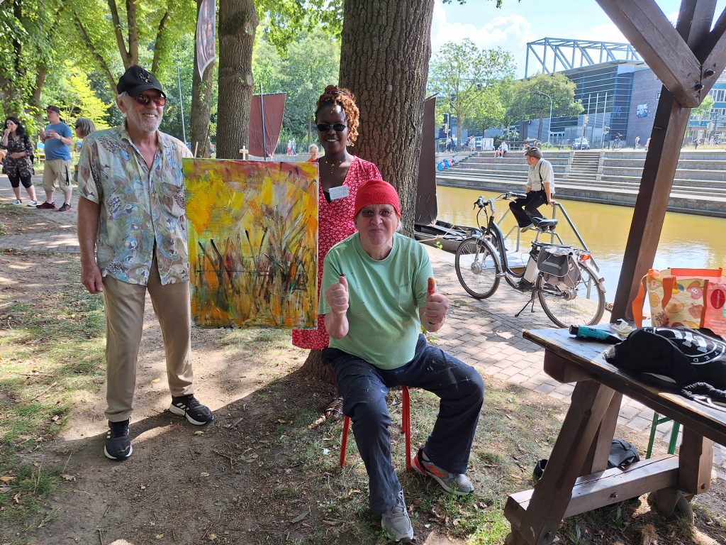 Clarisse Tankeu ist seit 2023 dabei, sie malt gern farbenfroh mit Acrylfarben. Sie hat in Osterholz eine neue Heimat gefunden, trägt gerne die Kleidung aus dem Kamerun. Sie kocht afrikanisch und backt deutsch-französisch.